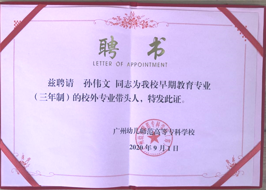 校长丘毅清为孙伟文颁发早期教育专业(三年制)校外专业带头人聘书。